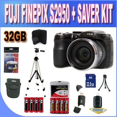 Easy upload to Facebook and YouTube;Capture images and video to SD/SDHC reminiscence cards (not included).14-megapixel CCD sensor; 18x vast-angle optical zoom lens.14 million impactive pixels; 1/2.3 inch CCD with main colour filter; 18x optical zoom lens plus approx 6.7x digital zoom.3.0 inch TFT colour LCD monitor plus digital viewfinder; HD film 720p with sound;6 scene SR AUTO; Motion Panorama mode with auto stitch.Motion Panorama capturing mode; 720p HD movie capture; mini-HDMI output. This Kit Includes:1- Fujifilm FinePix S2950 14 MP Digital Camera Brand New USA w/Manufacturer's Supplied Accessories1- three2GB SDHC Memory Card (Dont Miss a Memory!)1- USB SDHC Memory Card Reader (Download Images Quicker!)2- Sets of 4 NIMH AA Extended Life Batteries1- AC/DC Rapid Battery Charger1- Padded Carrying Case w/Strap (Keep It secure and Protected)1- Full Size Tripod 1- Memory Card Wallet (Stay Organized!)1- Pack of LCD Screen Protectors (Protect from Dust &Scratches!)1- Lens/LCD Cleaning Kit1- Mini Table Top TripodMore about this digital camera: The FinepixS2950 digicam boastsa high decision 14 megapixel CCD, abright 3.0" LCD screen (460K dot decision)plus viewfinder, andaward successful Fujinon optics geared up with a18X Optical Zoom.The Finepix S2950 isalso intuitive and straightforward to function, and packed filled with helpful options and technologies. With its mega 28mm wide-angle to 504mm telephoto lens, the S2950 can capturea vast number of pictures. The S2950 additionally featuresa robotically stabilized 14 megapixel CCD sensor and high ISO sensitivity surroundingsswhich mix tooffer Fujifilm’s Dual Image Stabilization technology.Thiscombination reduces the blurring impacts inmany taking images conditions. Also Panorama mode, HD movie, Face Detection,and Easy Web Uploader mix with a host of alternative features to make theFinepix S2950 a feature-packed and versatile shooter for just about anyphotographer.. Read more Fujifilm FinePix S2950 14 MP Digital Camera with Fujinon 18x Wide Angle Optical Zoom Lens and 3-Inch LCD (Black) + 32GB SDHC